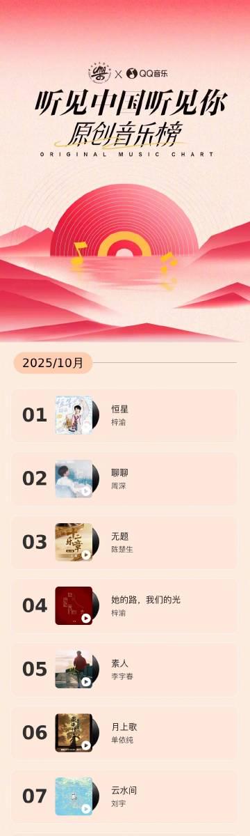 先来看看这个月有哪些值得一听的原创好歌。’听见中国听见你’10月榜单新鲜出炉,周深的《聊聊》以空灵嗓音征服听众,陈楚生的《无题》延续了他一贯的深情风格,李宇春的《素人》则展现了独特的音乐态度。特别值得一提的是新人梓渝,一人独占两首作品,《恒星》和《她的路,我们的光》都让人耳目一新。