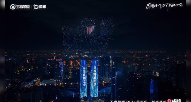 昨晚的朋友圈和微博,是不是又被《王者荣耀》刷屏了?成都夜空中那场惊艳的无人机灯光秀,让无数国内玩家热血沸腾——数百架无人机在夜空排列出游戏角色和「十周年」字样,双子塔化身巨型屏幕,峡谷的星光仿佛真的坠入了人间。